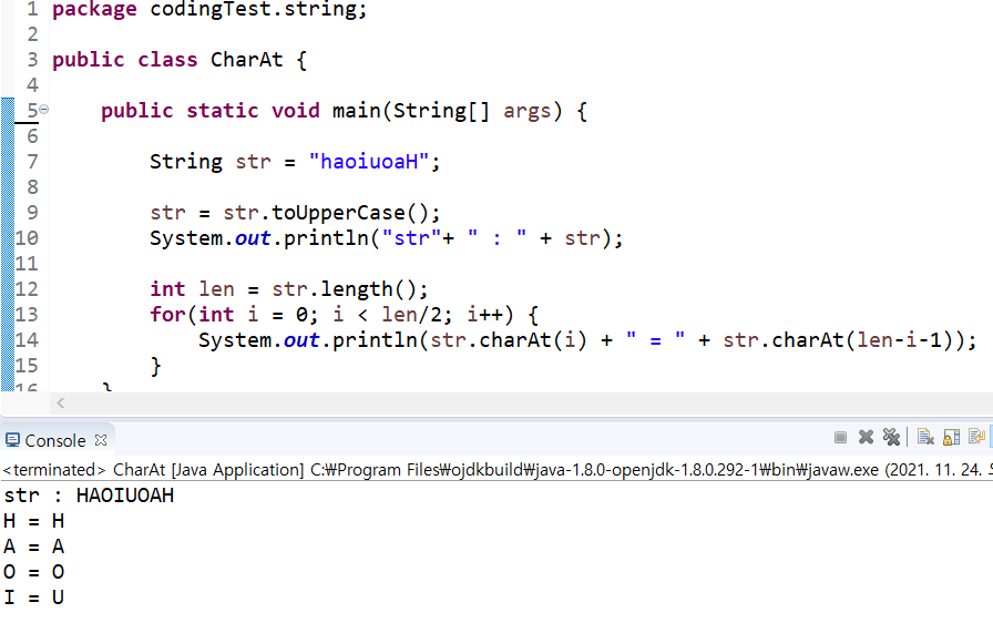 2) CharAt(i) : 문자열의 인덱스 번호(i)에 해당 문자를 char형으로 변환