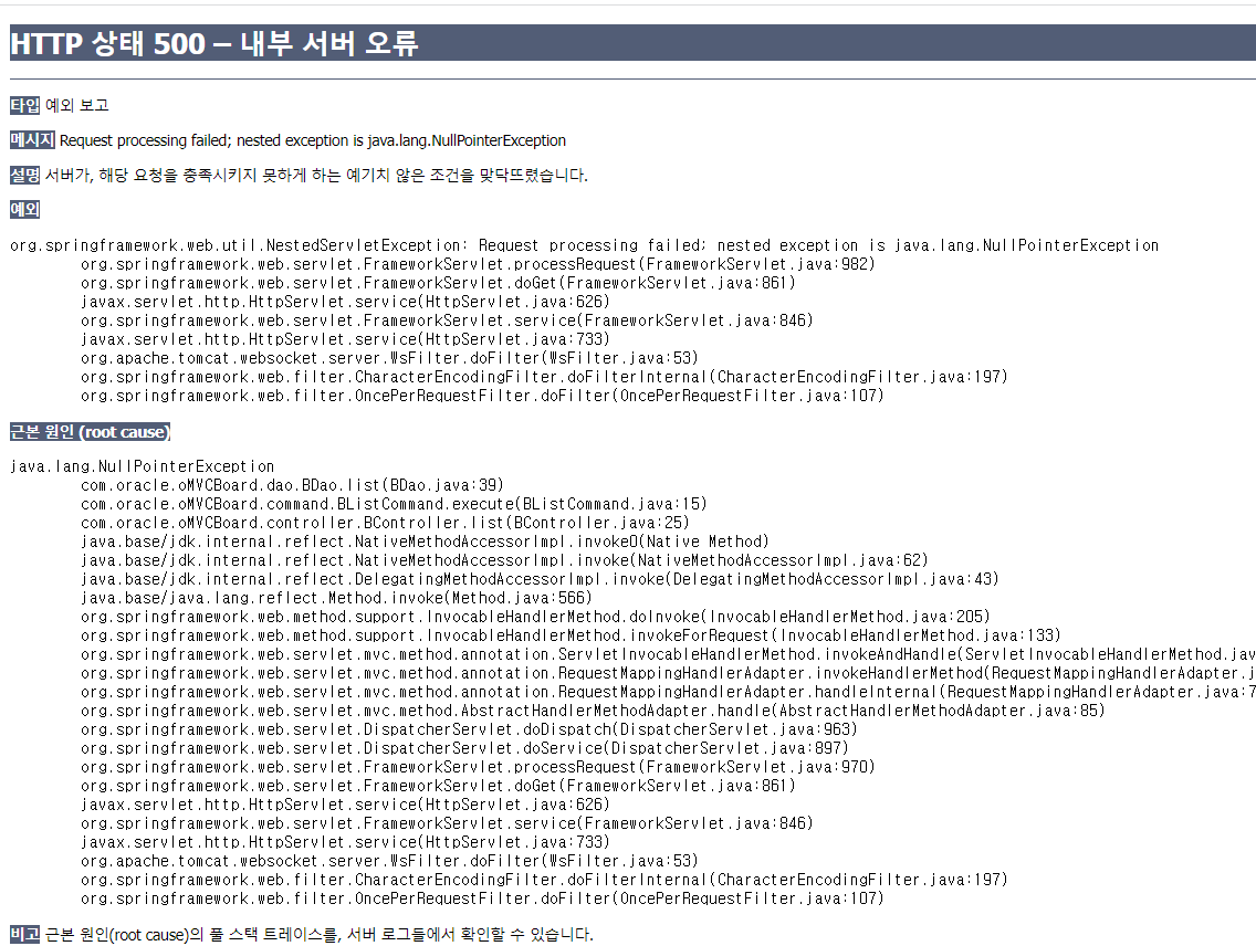 -> 해석해보면 Controller list까지는 실행됨. 이후 DB 연결 부분에서 오류가 발생함.