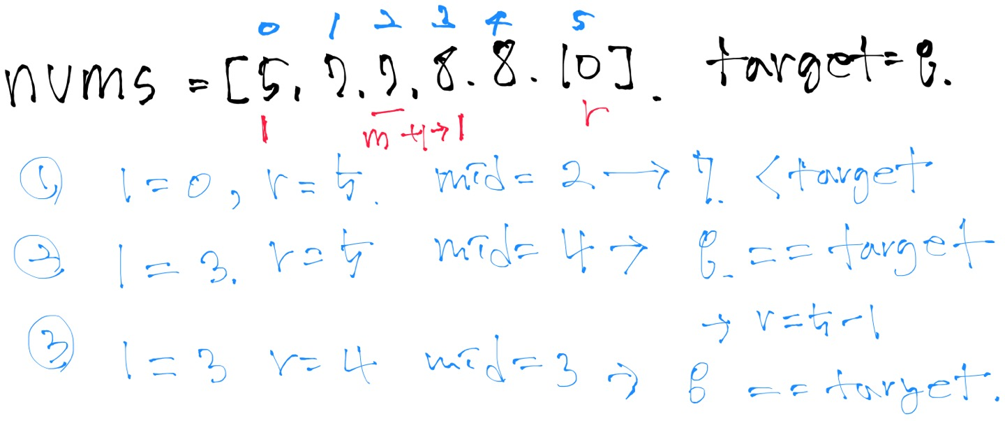만약에 target 이 1개만 있다면 2번에서 break로 함수를 마칠 수 있지만, 이문제는 양 끝을 구하는 것이기 때문에