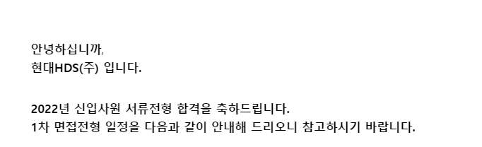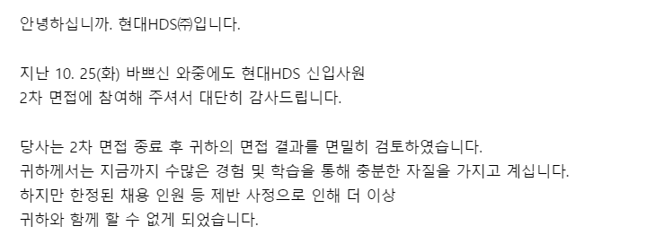 - 정말 정말 너무 아쉽고, 슬펐지만 PT 면접도 경험해 볼 수 있었고 여기까지만 온 것으로도 그 동안 나의 준비가 틀리지 않았구나 라는 생각을 하게 해주었던 시간들이었다. 현대 HDS 화이팅~!! 나도 화이팅!